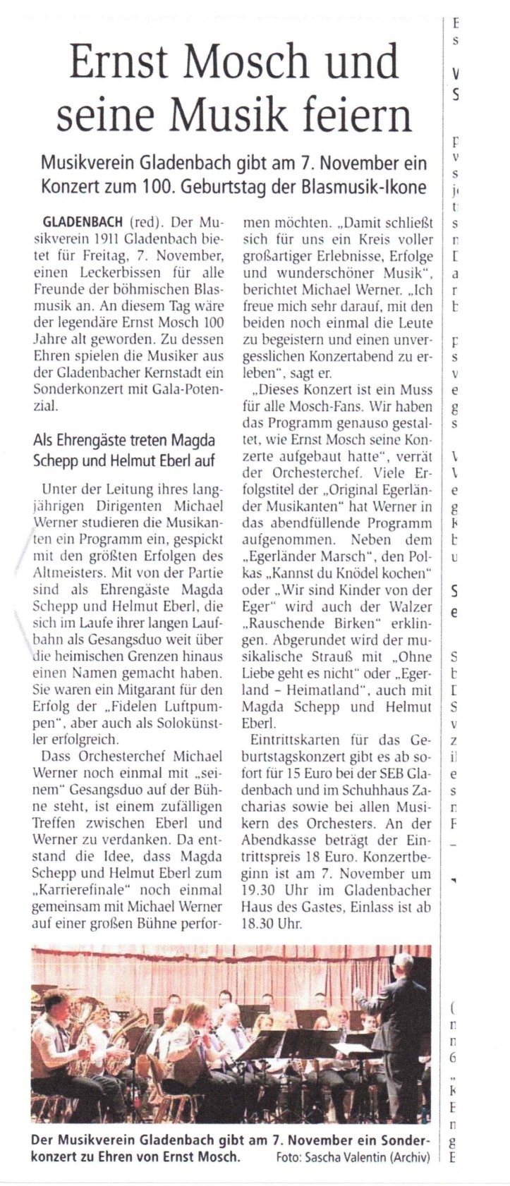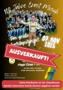 Am 7. November wäre Ernst Mosch 100 Jahre alt geworden. Ein guter Grund, sein musikalisches Leben zu feiern. Mit einem großen Konzert am 7. November im Haus des Gastes in Gladenbach würdigen wir seine Erfolge und sein Leben.